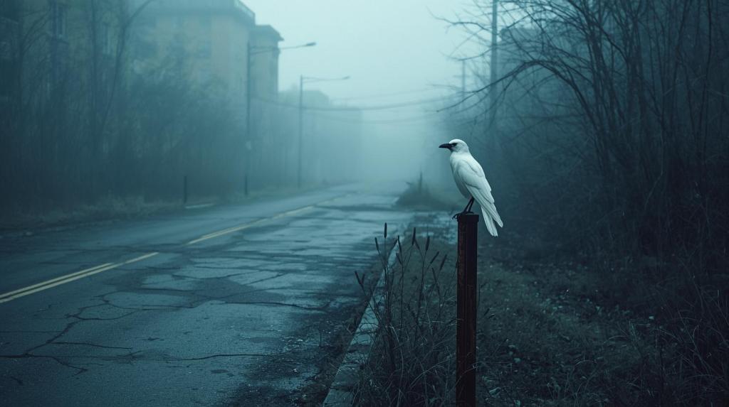 A metà strada, su un palo arrugginito a bordo di quello che era stato un marciapiede, un corvo bianco mi guardava in silenzio.